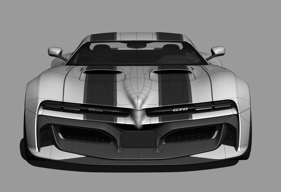 The GTO is a muscle car, and sections and proportions must guide the design process; this is why it almost does not have feature lines other than the front and rear graphics, plus the side fender crease line that fades out on the rear muscle.