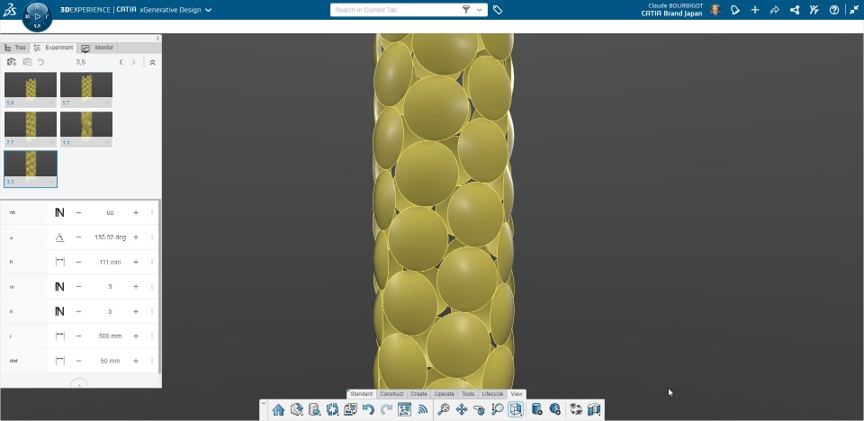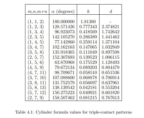 let me pass the math... but above condition is met with below triplets of parastichies orders (m, n, m+n) that allows calculation of (alpha,h,d) for geometry inputs. d is the diameter of the circles. there is infinity of allowed triplets... I just took the ones in the book