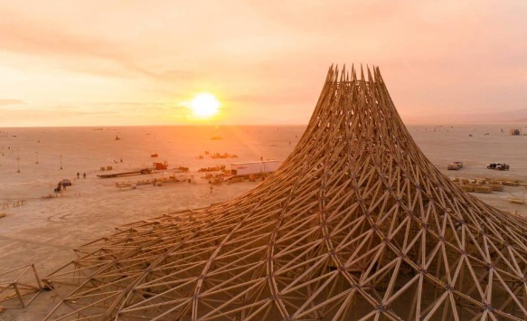 The triangular trusses form different paths towards a central space holding a giant 3D printed mandala, the heart of Galaxia.
