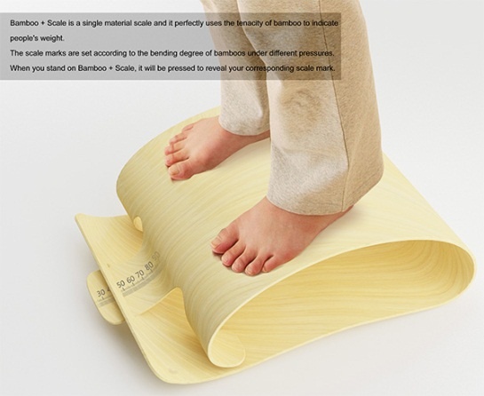 Made of bamboo, there is a scale at the front indicating your weight. Your weight will press the scale and make it lower. Because of the bamboo's tenacity, the heavier you are the lower the scale will be.