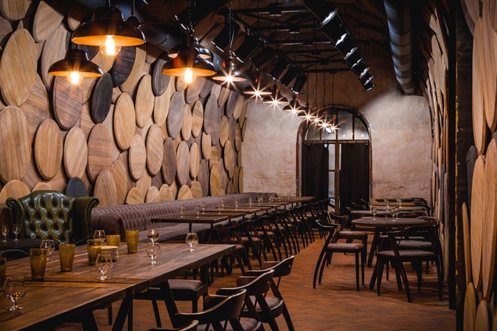 This 19th-century cellar in Odessa, Ukraine, has been redesigned as a brandy museum and brandy bar named Shustov by design studio Belenko Design Band. The dark and mellow ambience suits the space perfectly, just as it highlights the venue’s character and history. Naturally with wood as the material of choice, oaken timber cover the tables and real barrel tops have been placed all over the walls in multi-layered random patterns (cleverly accentuated with rows of theatre-type lights hanging from the ceiling). In the lobby, the ceiling has been covered with approximately 20,000 brandy bottles, creating an undulating installation of light welcoming the guests. Shustov’s bespoke chairs - with their gracefully bending armrests – have also been designed by Belenko Design Band.