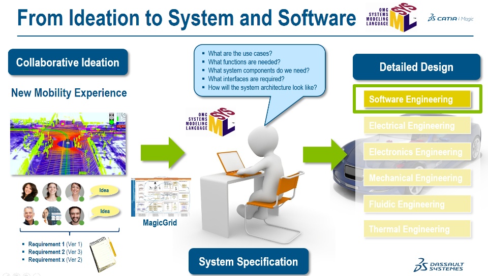 A key part of this presentation was the continuity between systems engineering and software engineering. Nowadays functional innovations for a new mobility experience are defined in the upstream systems engineering part of the process. This analysis and specification step can be done very nicely using the MagicGrid. However, once the detailed vehicle system specification has been worked out it should serve as a starting point and requirements input for the downstream detailed engineering. In particular for SW-Defined Vehicles their is strong need to establish a continuity into the SW engineering process. This continuity will be needed to ensure consistency and compliance of the software implementation with the upstream functional innovation specified in the systems engineering process as well as enabling efficient change management processes.