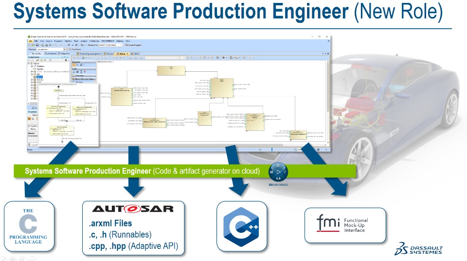 In order to facilitate this continuity Dassault released a new product called Systems Software Production Engineer (SOP) that generates from CATIA Magic models (SysML and UML) software artifacts in form of source code (C, C++), AUTOSAR XML files, FMUs, etc. that can be re-used in the software engineering process.