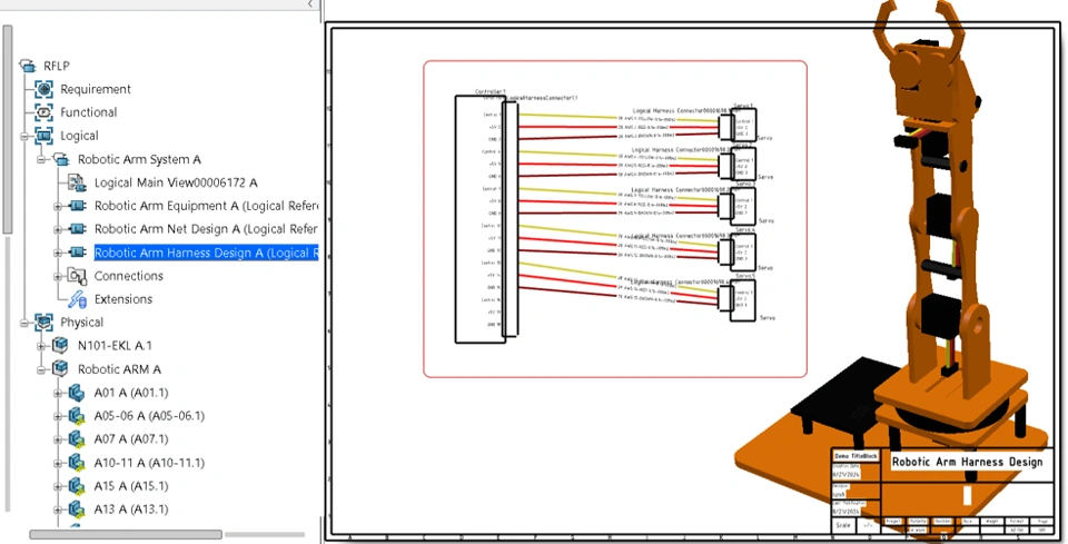 - Provides tools for accurate 3D wire harness routing and placement. Ensures connector and component alignment with mechanical constraints. Includes tools for bend radius, clearance, and mounting validation. Aligns with the logical layer in RFLP, integrating net and wire definitions.