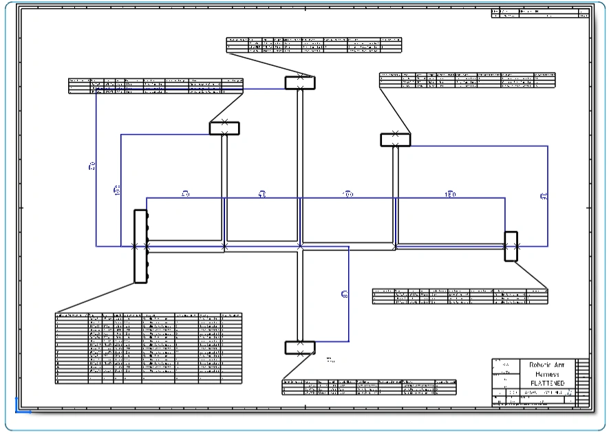 - Prepares harness designs for manufacturing with flattened layouts (Figure 10). Defines wire-cutting lengths, branch setups, and protective coverings. Supports documentation for efficient manufacturing instructions. Syncs with 3D routed harness to reflect changes and ensure accuracy.