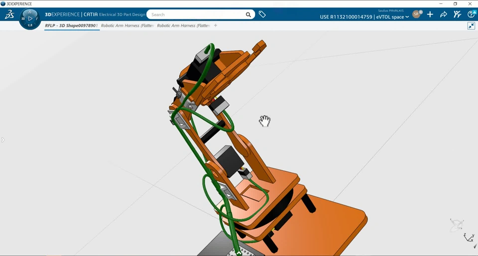 Electrical and manufacturing engineer performs flattening of 3D wire harness for manufacturing (Figure 11). Generating absolute or algorithmic scale full product specification. From system engineering side we get as an input behavior requirement for compliance with system movement freedom and required length of the wire harness. Also, power, electrical interference, and interface requirements between wires based on system mission.