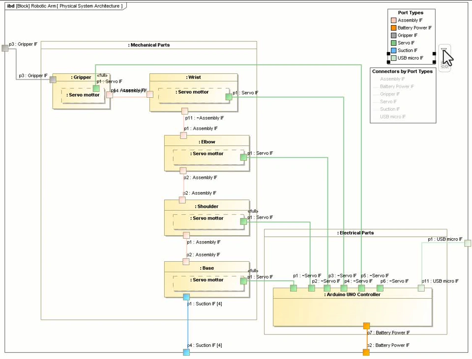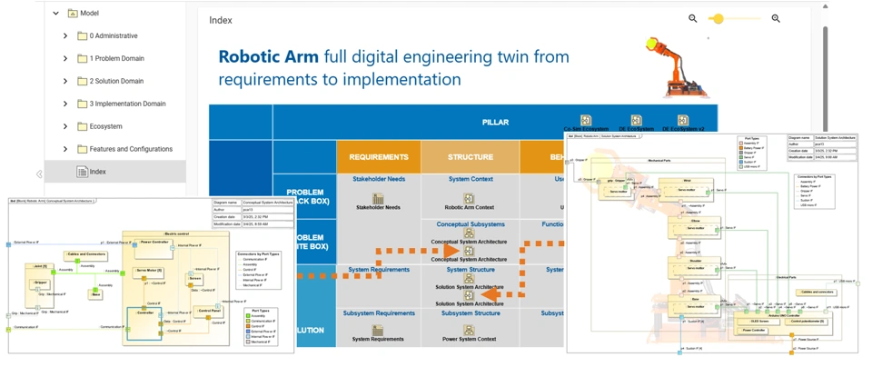 This project presents a comprehensive digital engineering example using MBSE and a digital twin in the context of a portable robotic arm. The project demonstrates the practical impact of systems engineering across the product lifecycle, showcasing integration between disciplines such as systems engineering, electrical and mechanical design, manufacturing, implementation, and verification & validation (V&V). It emphasizes the use of a digital thread and co-simulation with tools and standards like SysML, Modelica, and FMI.