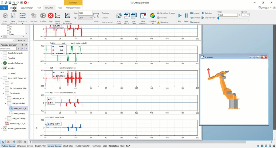 - Dymola – Multiphysics simulation. We can track each joint voltage, current, torque.