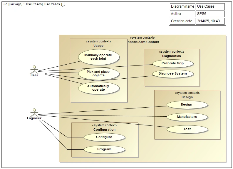 System Context – We start modeling by defining systems boundaries, identify external interfaces, identify system contexts e.g. operation, modification, configuration. This step is mandatory to understood system boundaries, environments – context, high level interfaces. Big part of the environment where system exist is digital environment where all models coexist as digital twin for rapid system change, configuration, testing, and shipment to market.
