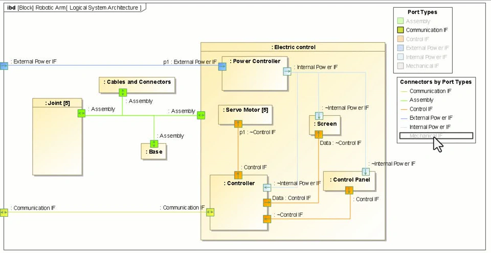 - follows solution architecture in SysML; initiates interface implementation. establishes pin-to-pin connectivity between equipment connectors for signal or power flow. provides a logical framework for wire harness connectivity and signal guidance.