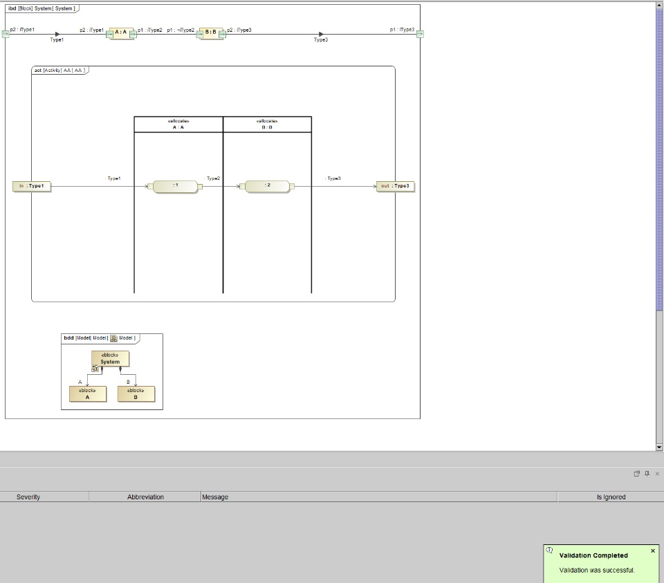- ObjectFlow between :1 and :2 is not realized by an ItemFlow ( it should create an ItemFlow with Conveyed Type2). It show the popup "validation was successfully" but the above mentioned ItemFlow is missing