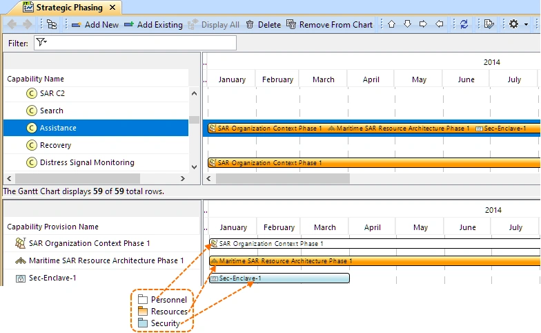 Magic Systems of Systems Architect / Cameo Enterprise Architecture adds key enhancements to Gantt charts, diagramming, and other capabilities, aimed at improving clarity and usability. The Strategic Phasing Gantt Chart now includes domain-based color-coding, and a new hierarchical view has been added to the Strategic Actual Strategic Phase Taxonomy Table. Other updates include enhanced element creation in UAF maps and a consistent approach to descriptions across matrices and tables.