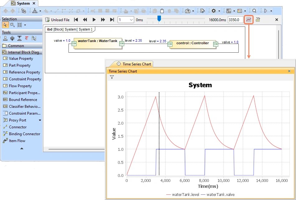 Magic Model Analyst / Cameo Simulation Toolkit release, the Results Player has been enhanced with new features for better data analysis and usability. Now, it supports generating Time Series Charts from CSV files, exporting time-step data to an Instance Specification for simulation, and drag-and-drop functionality for easier file loading. The #SIMULIA Process Composer integration is officially out of the technology preview phase, supporting execution on both on-premise and cloud 3DEXPERIENCE platforms, with added support for Array parameters. Additionally, Cameo Simulation Toolkit has improved #Modelica #SSP export for seamless simulation with Dymola and introduced an Image Library with a variety of icons you can use on diagram shapes.