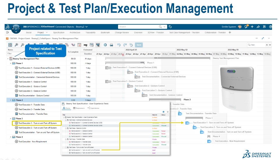On the right it illustrates in real-time the traceability relationships between requirements and test cases. The test specifications can also be equipped with additional data, e.g. which item we are testing against (in this case a physical product) as well as a project to which we want to link this test specification. If you specify a project then the test executions will show up as "tasks" in this 3DEXPERIENCE project. That means this test specification can either be a standalone project itself or it can be part of an overarching project plan for the product that is to be developed. This is very useful and will allow us to also define the schedule for the test executions so that we have a clear overview when each test will be executed. This allows us to also plan the needed & available resources, all aggregated and represented in a nice Gant Chart.