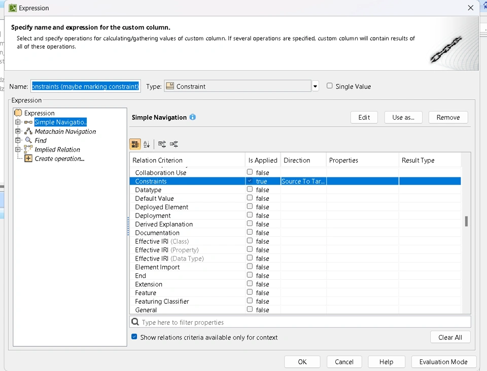 In the table, we can see the tool shows this for the elements (blocks, parts and others). The value column is a simple property on the block. The marking of the element is accessed via a custom column which gets the constraints of the element: