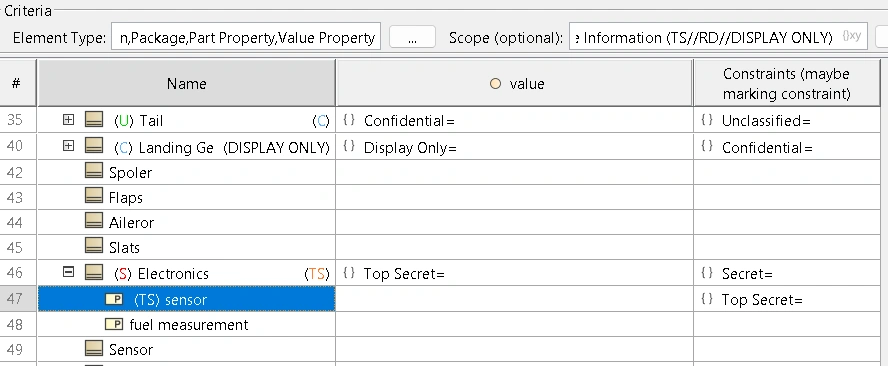 If you are using the Data Markings plugin, the tool is very good about annotating the data security levels. However, if you are using this data outside of the tool, you need to know how to get at the marking. For example, if exporting via excel or using VTL with the Report Wizard. The data is there, as the tool uses it, but how do you access the same information? Here is a block with a part where the block (Electronics) is S and the use of the part (senor) is set to TS. The result is that the block gets the rollup of the part and thus has both S and TS markings.