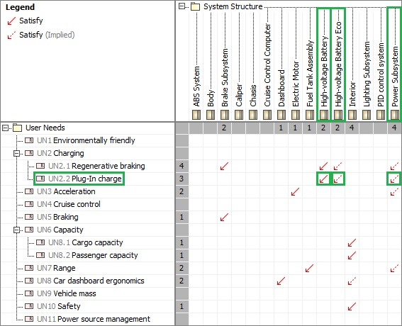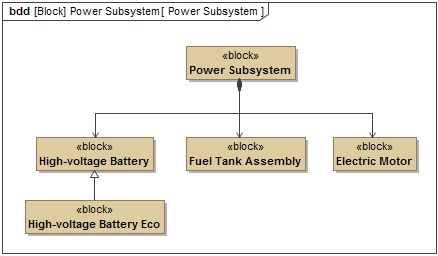 In the preceding example, the High-voltage Battery block satisfies the Plug-In charge requirement. According to the composition and generalization, Power SubSystem and High-voltage Battery Eco blocks should satisfy this requirement as well. These relationships are shown as implied and marked with red dashed arrows.
