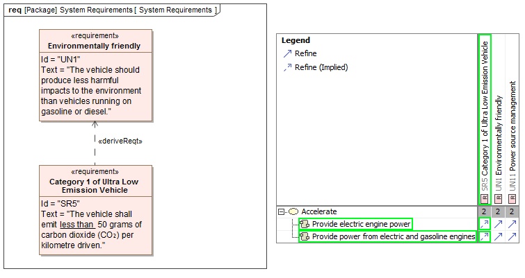 In this case, the Category 1 of Ultra Low Emission Vehicle requirement is derived from the Environmentally friendly requirement, which is refined by Provide electric engine power and Provide power from electric and gasoline engines activities. According to this, implied refine relationships between activities and derived requirement are displayed.