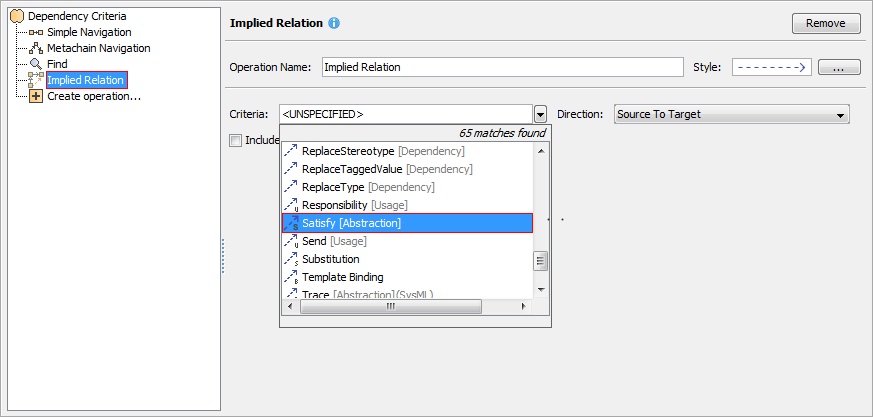 To show implied relationships, simply select the Implied Relation operation in the Dependency Criteria dialog and choose needed criteria from the drop -down list as shown here: