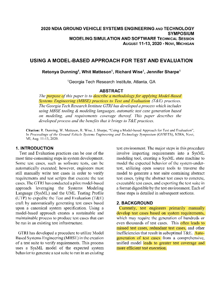 - The attached Test and Evaluation paper by Dunning et al. (2020) presents an MBSE method to auto-generate test cases based on state machine modeling of the System Under Test.
