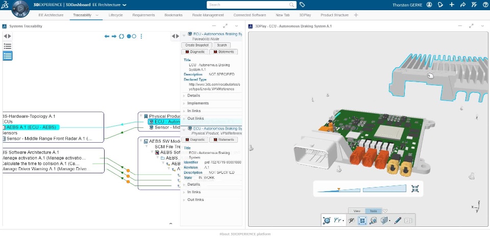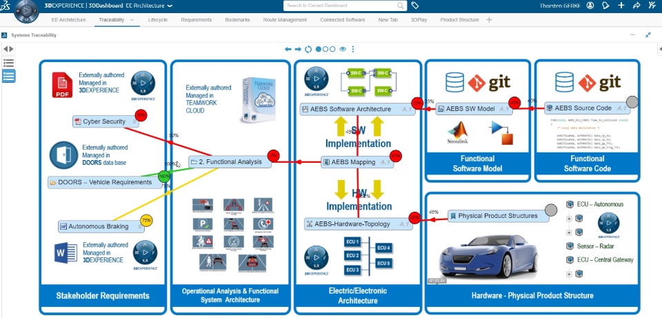 In the following demo example I have built a demonstration for an automotive customer that was exactly in such a change management dilemma and was looking for a solution to accelerate the impact analysis. The particular challenge, a heterogenous tool landscape where we need to connect data residing in different data bases and various different types of formats. The demonstrator was made for an automated emergency braking system function (a simplified version as we had only a short amount of time to built it). The requirements were authored primarily in DOORS and managed in a DOORS data bas paired with requirements in Word and PDF docs. From these requirements a system specification was evolved using the MagicGrid in CATIA Magic in SysML and the data was stored in TeamWorkCloud (nowadays called Magic Collaboration Studio). An alternative way to manage the CATIA Magic data is the new Power'By technology to store the models directly in 3DEXPERIENCE. Subsequently a partitioning was performed to define which pieces of that system specification go into software and which ones go into hardware. The detailed behavior model for the software part was created in Simulink and software code was produced from that which is managed in git as SCM system. For the hardware a physical product was created in CATIA. All of that was than assembled to an end-to-end traceability model in 3DEXPERIENCE. The demo video below shows the following areas: