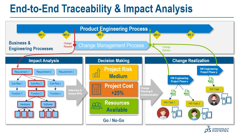 ... and possibly lots of other questions to support our decision making. At the end of the day, we need to decide whether we do the change or not (or do it just partially if possible). If we decide "yes", then we have to start the change planning and execute the implementation. But an important piece to accelerate the collection of information for our decision making is an impact analysis by leveraging an end-to-end traceability model in the 3DEXPERIENCE platform.