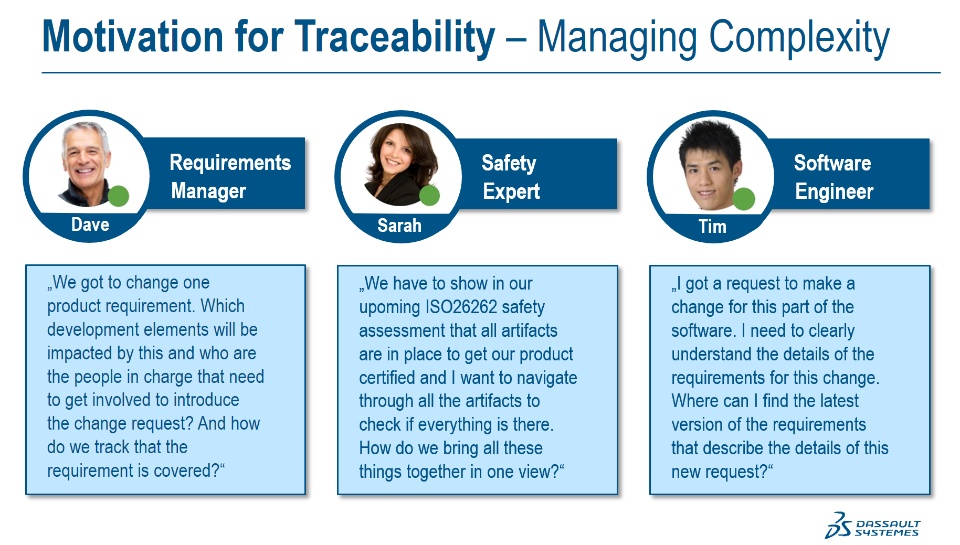 I am often asked by my customers "what's the benefit of establishing a traceability?". The best way to explain this is to put ourselves into the shoes of the people that are part of the engineering process. Assuming we have 3 members of our corporate engineering team who are fulfilling different roles in the organization: