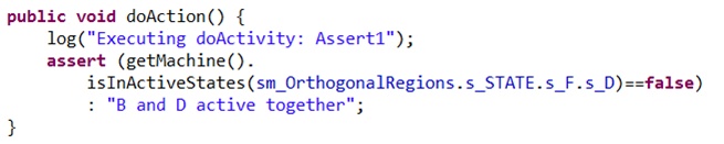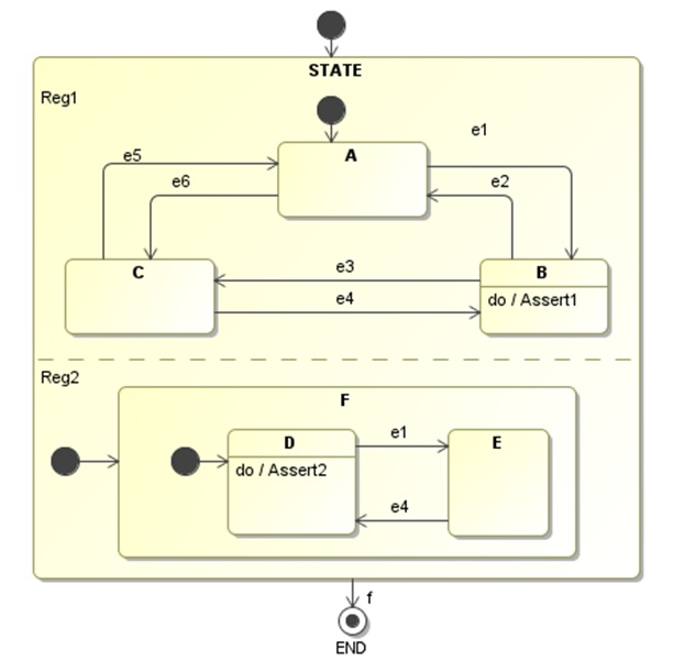 The Statechart in Figure 2 with orthogonal regions provides a straightforward example of a model checking application. The correctness property inserted is to ensure that state B and state E are never active at the same time: assert (inState(B) && !inState(D)).