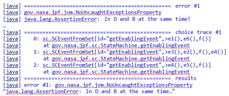 When JPF was run, it instantly found a counterexample to the assertion and output the error trace and performance statistics shown in the following figure. Following trace #1, error #1 was found because trace #1 defines an existing path that leads to B and E being active together. The statistics show that there is no elapsed time needed to perform this very basic model-checking task.