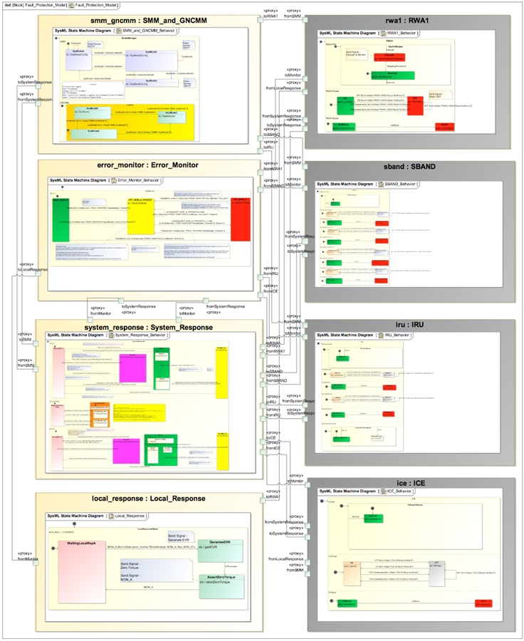 An idea of the overall complexity of the SMAP model is provided in the following figure. The SMAP Fault Protection Engine consists of an Error Monitor Statechart and Response Statecharts. External signals from device Statecharts, such as a reaction wheel, and the mode manager Statechart are input to the Fault Protection Engine.