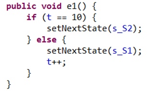 This Statechart is translated to Java using COMODO and the correctness property has been inserted manually into the code as shown in.