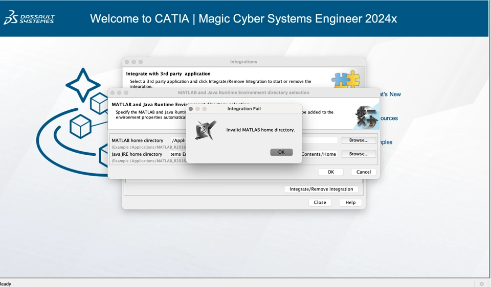 I’m running into a frustrating issue while trying to integrate MATLAB into CATIA Magic Cyber Systems Engineer 2024x Refresh 2 on my Mac (macOS Sequoia 15.4).