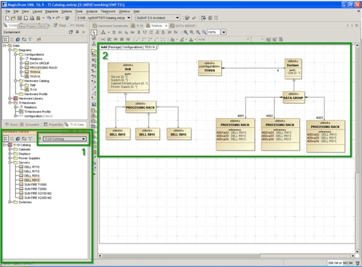 The process of constructing a baseline from a set of catalogs is shown in Figure 2. In this case, a variant configuration from the TI10/APB09 baseline is being constructed for a specific class of submarines. The TI10 hardware catalog is open in the browser on the left side of the screen capture (1), and specific servers are being configured into processing racks that will be installed on the submarines (2).