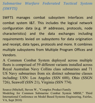 Submarine Warfare Federated Tactical Systems (SWFTS) program (see the side bar) provides parallel management of external interfaces to the combat system and internal interfaces between subsystems within the combat system.
