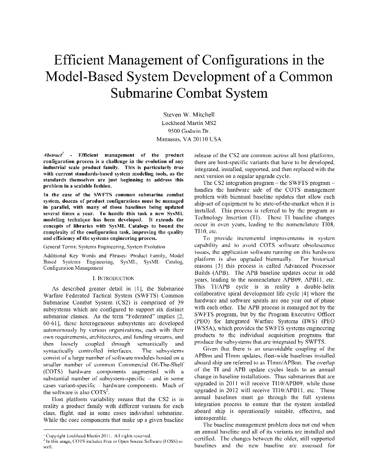 In order to manage growth, complexity, and demand for resources of mission critical systems, Lockheed Martin Corporation (LMCO) has transitioned to using Model Based Systems Engineering (MBSE) (see the side bar) in large scale. The transition was very successful; but it also required adopting best practices along the way. The newest MagicDraw version provides real–life project capabilities (i.e. Smart packages) out of the box, which will provide further productivity and quality gains supporting configuration management approach.