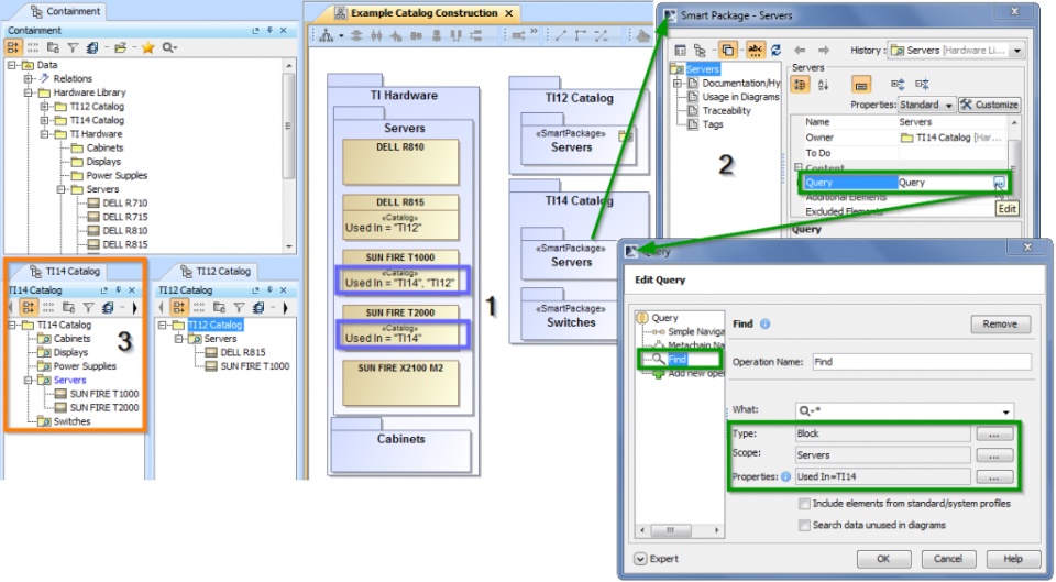 Alternative solution is to construct catalogs based not on the import relations, but on properties values (1) Figure 6. Find query (1) is used to search for catalog TI14 components and show them in TI14 Smart package (3).