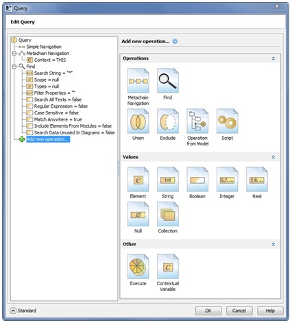 Smart packages are query based. The newly enhanced query engine (Figure 4) is extremely flexible and is now the most powerful in the modeling tools industry. The criterion can be as simple as a UML relationship and as complex as an Object Constraint Language (OCL) expression. You can define the following flavors of criteria: Simple criteria, OCL expressions, Meta chains for navigation through chains of properties, and Java code.