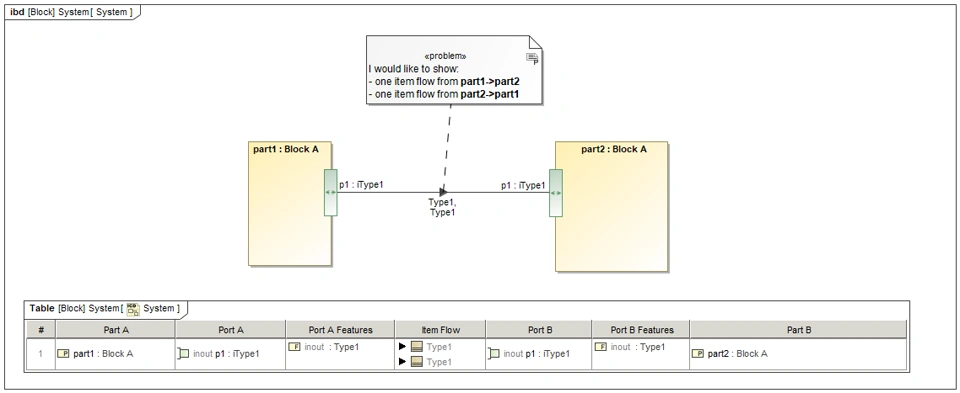I have a problem with itemflows on Internal Block Diagram (IBD) where two parts are typed by the same Block (BlockA). The diagram includes a connector between these two parts (part1: BlockA and part2: BlockA).