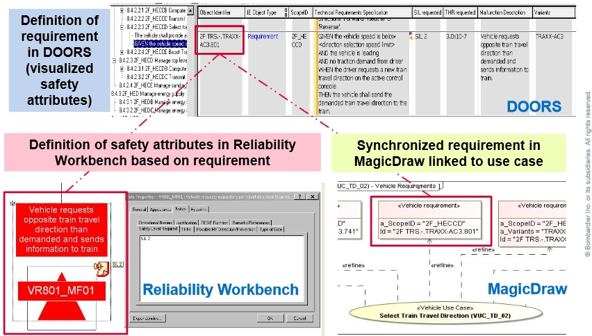 Bombardier Transportation applied an MBSE solution for modeling rolling stock such as trains, locomotives and metros and their integration into the railway system, based on the system requirements and safety attributes which are integrated from the requirements management and safety analysis work.