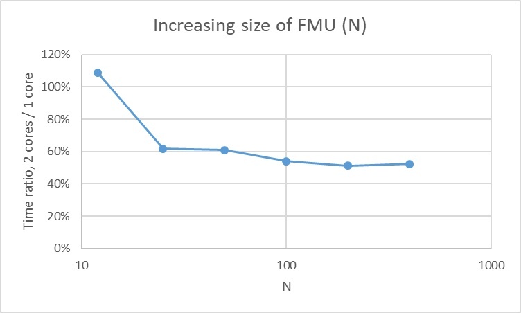 When the system size is small, then the FMU is too cheap and the overhead has an adverse affect. For N = 12 the full co-simulation takes only about 0.1 s. For sizes of N = 100 (about 8 s on two cores) and above, the parallelization performance is close to optimal.