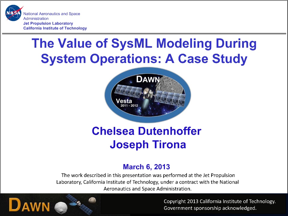 - Dawn’s prime mission is eight years long, so there is risk of the GDS system documentation becoming out-of-date. The transition of personnel over the course of the mission makes it even more important to maintain a single accurate representation of the system. Capturing this information in the model mitigates this risk.
