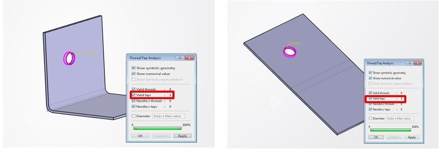 Highlight is delivered to enable the detection of threads and taps through Tap-Thread Analysis command on SheetMetal holes in both Flat and 3D views.
