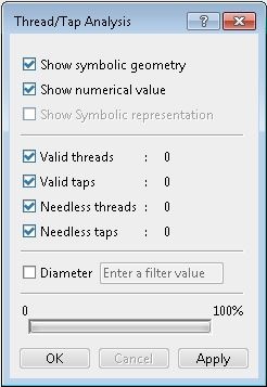 With Tap-Thread Analysis command the number of valid threads or taps are displayed in the dialog box. After clicking apply button the representations are shown at location of holes with display of thread diameter, depth and pitch. The representations are created in both views 3D and flat at the respective location of holes in that view. The representations created are not persistent, they are lost when the command is deactivated.