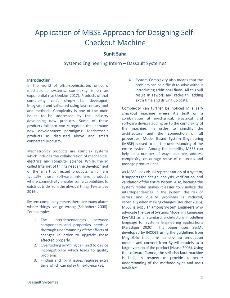 With the ever fast moving world, demand for efficient and smarter products has driven industry to look for new and complex solutions. One of the means of addressing complexity in solutions is to adopt MBSE as a standard practice for any product development. The paper presented here highlights use of MBSE process for designing a product like Self-Checkout machine. The paper also features the use of MBSE methodology like MagicGrid as well as use of tool like Cameo for the same.