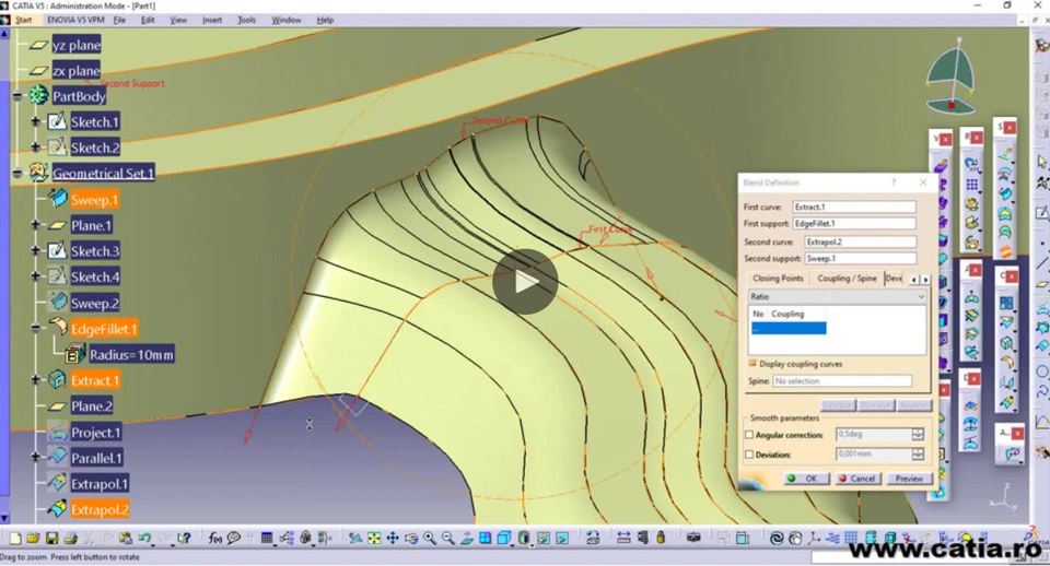 CATIA v5 How to connect and trim two surfaces using Blend by @IG