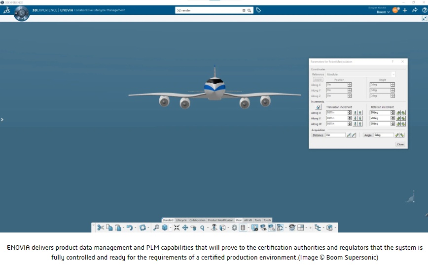 Dassault Systèmes’ 3DEXPERIENCE platform, including CATIA for 3D modeling and ENOVIA for product data management, fits the bill. Boom believes the 3DEXPERIENCE platform promises to streamline collaboration throughout its value network and eliminate file-based data storage, which ensures real-time digital continuity. The 3DEXPERIENCE platform offers Boom true parametric modeling capabilities at a system level.