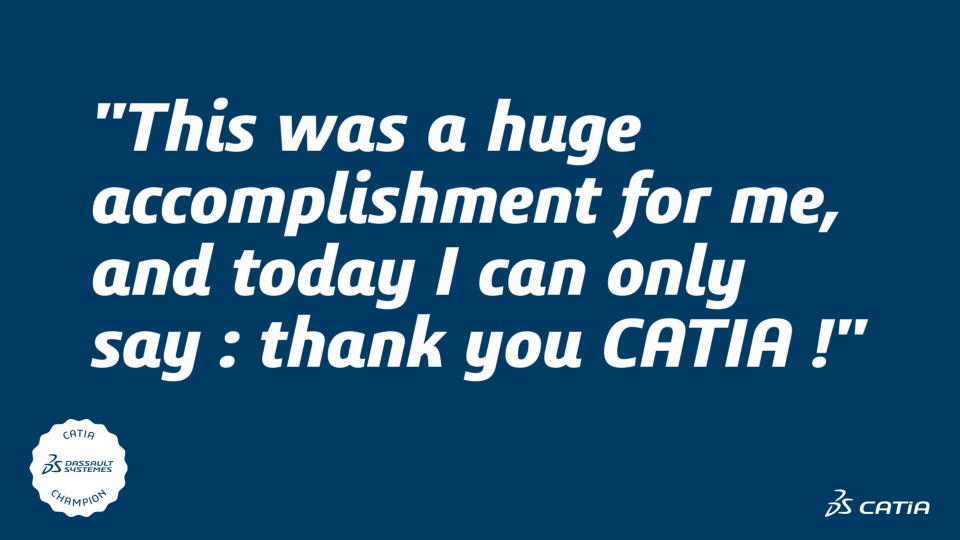 Last month, I had the chance to exchange with him and he accepted to share and capture his CATIA Champion Story. With his expertise with CATIA V5 as a trainer and now as a 3DEXPERIENCE user, Dimitri is a great advocate for Dassault Systèmes and CATIA. Listen to his story, and let us know what you think in the comments sections 😉
