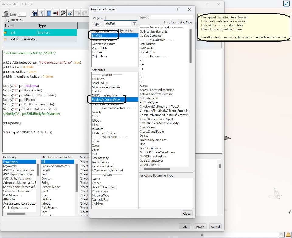 I would like to set Fold/UnFolded representation of Sheet Metal parts. I was looking through EKL and found attribute for FoldedAsCurrentView. It is read/write, but does not seem to change the actual state of the sheet metal component. Is it possible to set using EKL or using VBScript?