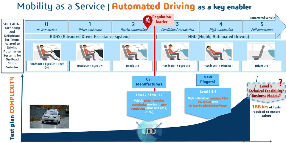 “Automated Driving is now a key enabler of Mobility as a Service. SAE has defined 5 levels of Automation. Most of today’s vehicles doesn’t go beyond Level 2, Vehicle System complexity & upcoming regulations make it very tough to introduce Level 3. Going Level 3+ requires several millions or billions of km of test drive to be performed. Therefore, there are no other options that to adopt massive virtual simulation”