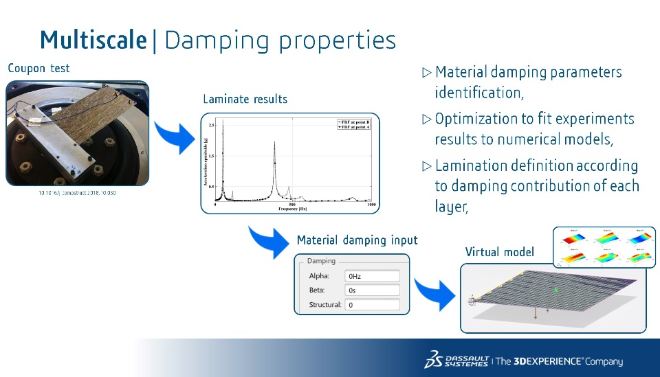 For the analysis of the composite plies, tests were physically made on small composite plates and then recreated in the 3DExperience platform. Post processing work is then done to identify the damping coefficients of each layer.